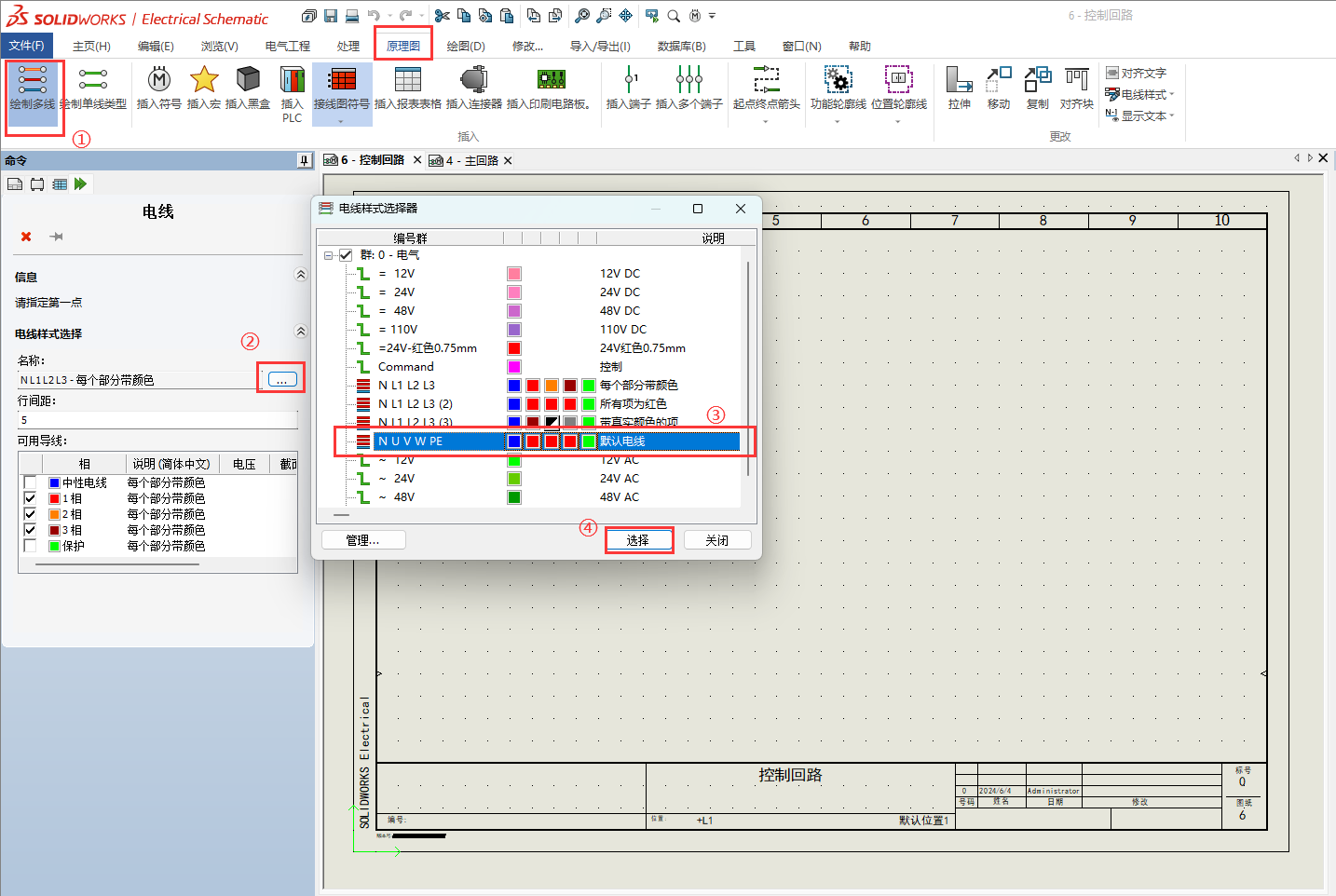 其实在SOLIDWORKS Electrical中,绘制单线与绘制多线并没有实质上的差别,本质都是绘制连接元件的电线。使用绘制多线按钮也能绘制单根线、使用绘制单线按钮也能绘制多根线,分类主要是方便我们管理和减少我们绘图时的操作,只要我们注意绘制电线的属性就可以了。